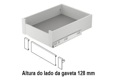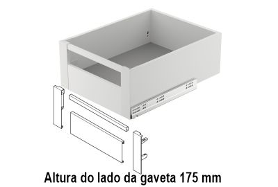 Lateral de gaveta interior Matrix Box Slim, composta por adaptadores frontais com três alturas (89m, 128mm e 175mm), vareta e perfil com 1100mm de comprimento.