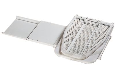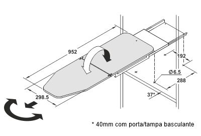 Tábua de engomar para montagem em prateleira dobrável, roda 180º, posicionamento em intervalos de 15º, totalmente pré-montada sem ligação ao painel frontal.