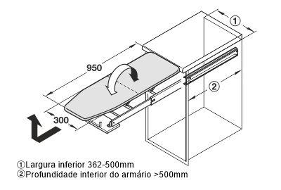 Tábua de engomar para instalação por trás da frente da gaveta. O suporte dobrável da tábua de engomar rebate automaticamente ao abrir a gaveta, com ajuste contínuo. Para montagem da tábua ver a ficha técnica.